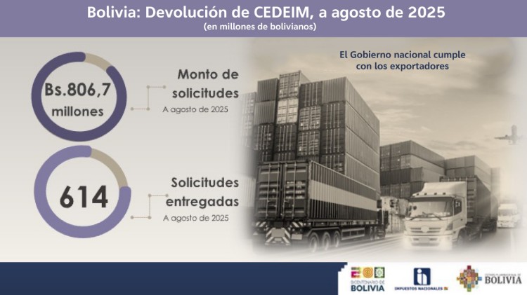 La Paz, 26 de septiembre de 2025.- El Gobierno nacional, mediante el Servicio de Impuestos Nacionales (SIN), devolvió al sector exportador boliviano un total de Bs806,7 millones a través de la entrega de 614 Certificados de Devolución Impositiva (CEDEIM), hasta agosto de 2024.